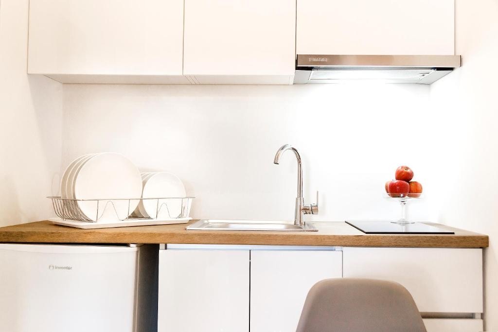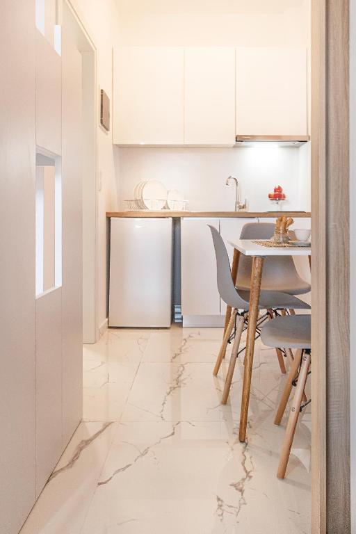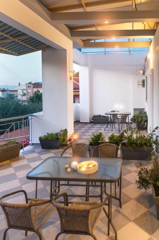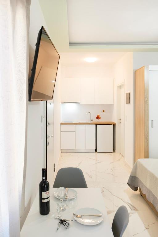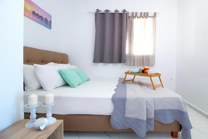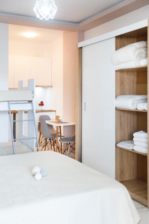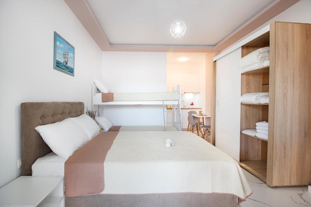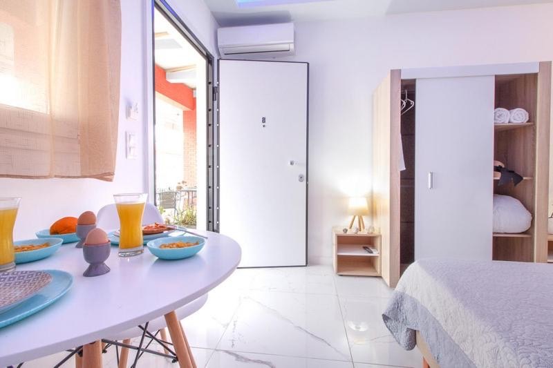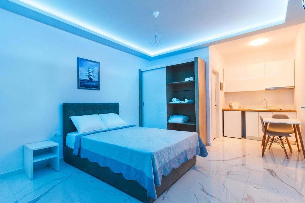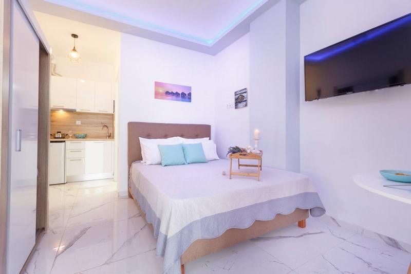 Студио број 1 е наменето за сместување на 4 лица (2 возрасни и 2 деца до 12 години). Студијата се опремени со еден брачен кревет и 2 креветчина на спрат. Секое студио има тоалет, мини кујна, ТВ, тераса и се наоѓаат на прв спрат.Студио број 1 е со поглед кон улицата која води до плажа.